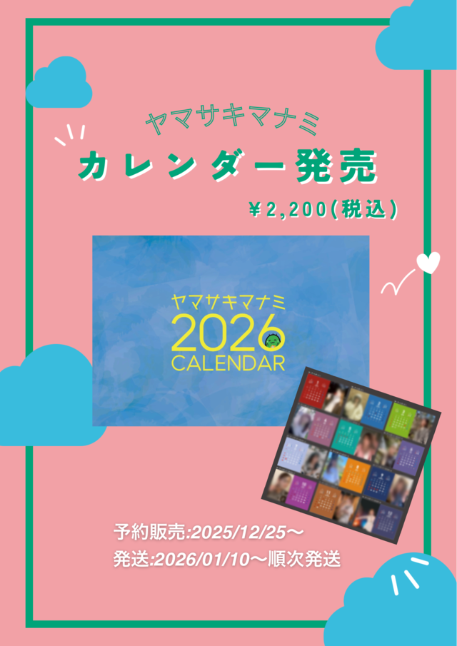 ヤマサキマナミ初のカレンダー! B6サイズの卓上カレンダーです。 2026年1月10日より順次発送致します。 ※サイン希望の方は備考欄へ希望宛名をご記入ください。